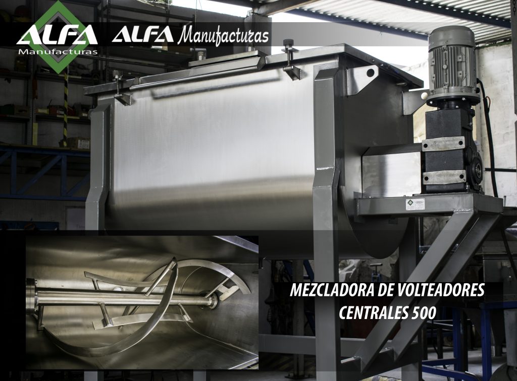 - Velocidad de salida: 44 RPM Cuerpo del mezclador (Artesa): Fabricado en lámina de acero inoxidable AISI-304 calibre 10 (3.43 milímetros de espesor).
